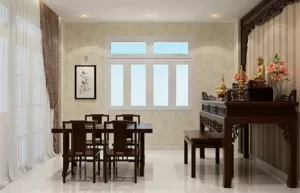 Nếu diện tích hẹp bạn nên sử dụng vách ngăn thạch cao phòng thờ kết hợp với ô cửa kính. Sử dụng kính bạn sẽ nhìn thông tường mang đến cảm giác thông gian rộng, bầu không khí trong lành hơn.